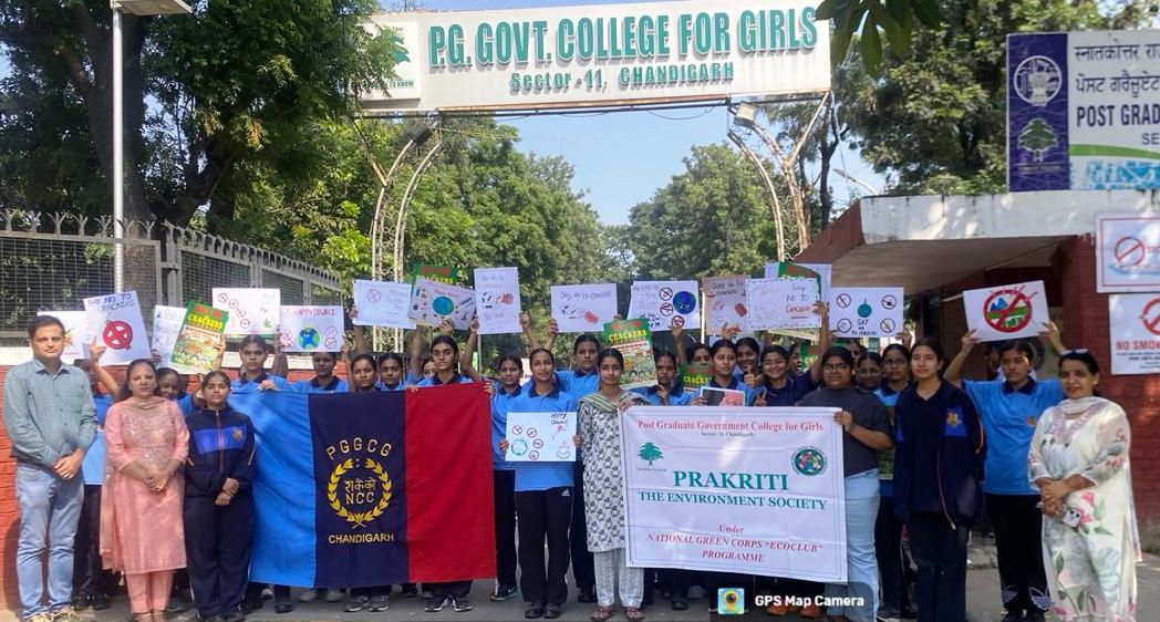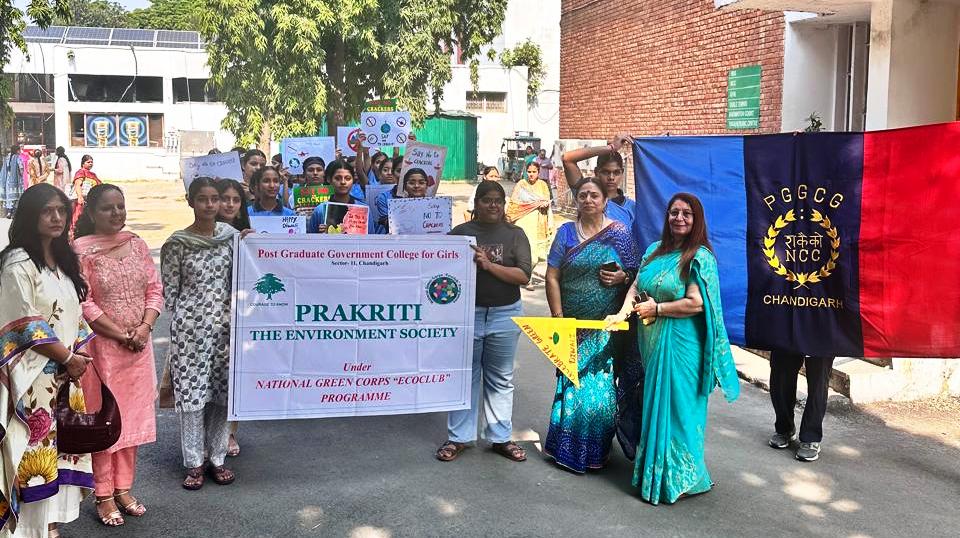 Prakriti – The Environment Society of Post Graduate Government College for Girls, Sector-11, Chandigarh organized a two-day Anti–Cracker Awareness Campaign on 18.10.2025 with the aim of spreading awareness about the harmful effects of firecrackers and promoting the celebration of a green and pollution-free Diwali.